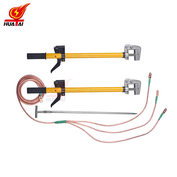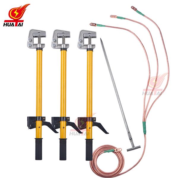 (2)110KV黃色手拉式接地線安裝:將接地軟銅線分相上雙眼銅鼻子固定在接地棒上的接電夾(接電夾有固定式和活動式)相應位置上,將接地線合相上的單眼銅鼻子固定在接地夾或地針上,構成一套完整的接地線。