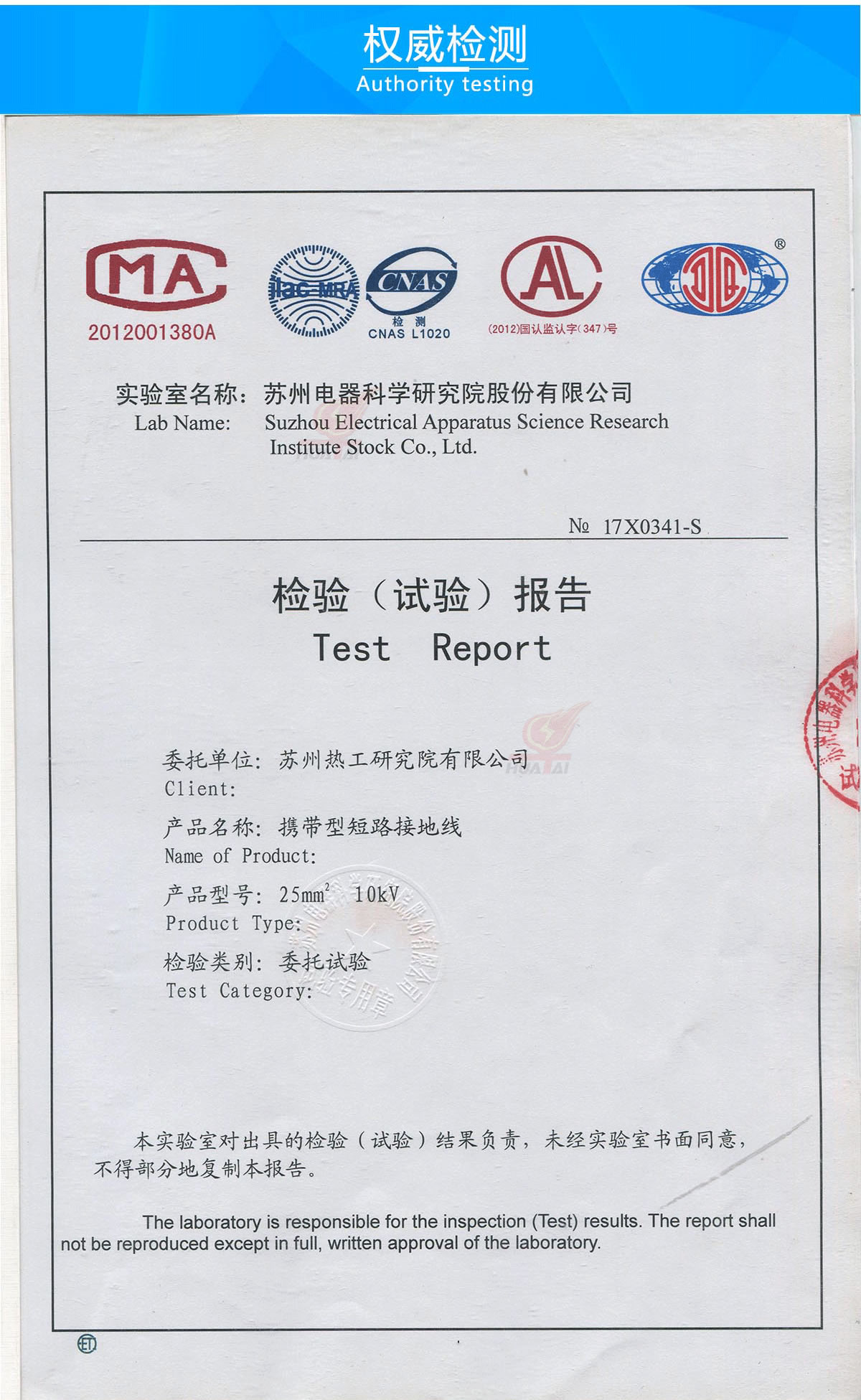 (2)35KV黃色手拉式接地線 標稱截面:25mm2 總根數:810 平均直徑(mm):0.2mm 計算截面:(mm2):25.43 金屬接頭部分長度:50 mm 節數:1 桿徑:30mm