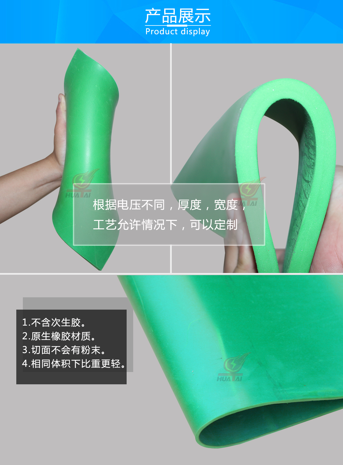 我公司的絕緣膠墊是采用性能優良的非極性純橡膠制作,不含次膠、廢膠、再生膠和任塑料成份。膠墊表面電阻和體積電阻穩定,單位面積比重大、平展性能好,物理性能穩定。