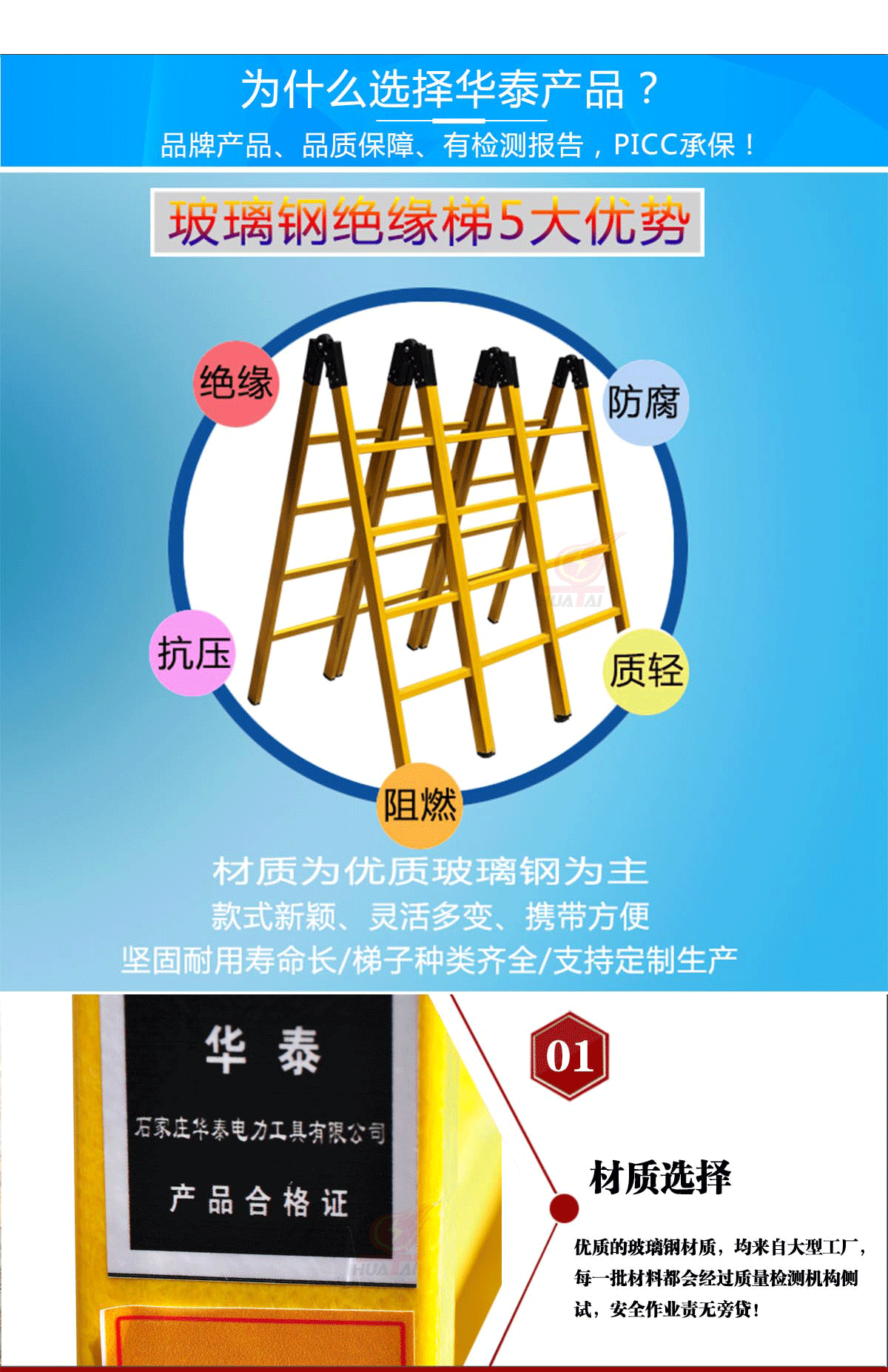 絕緣梯采不飽和樹脂和玻璃纖維聚合拉擠制造工藝,材質選用環氧樹脂結合銷棒技術,軸類鋼制件表面有防護鍍層;絕緣層壓類材料制件加工表面