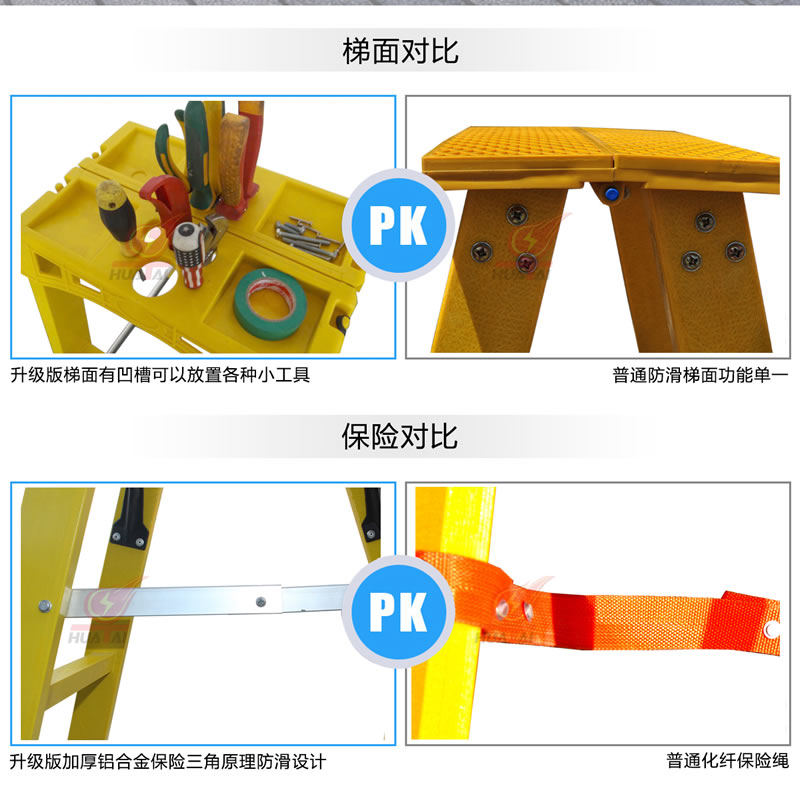 升級版玻璃鋼絕緣人字梯材質: 由不飽和樹脂和玻璃纖維混合而成的絕緣玻璃鋼