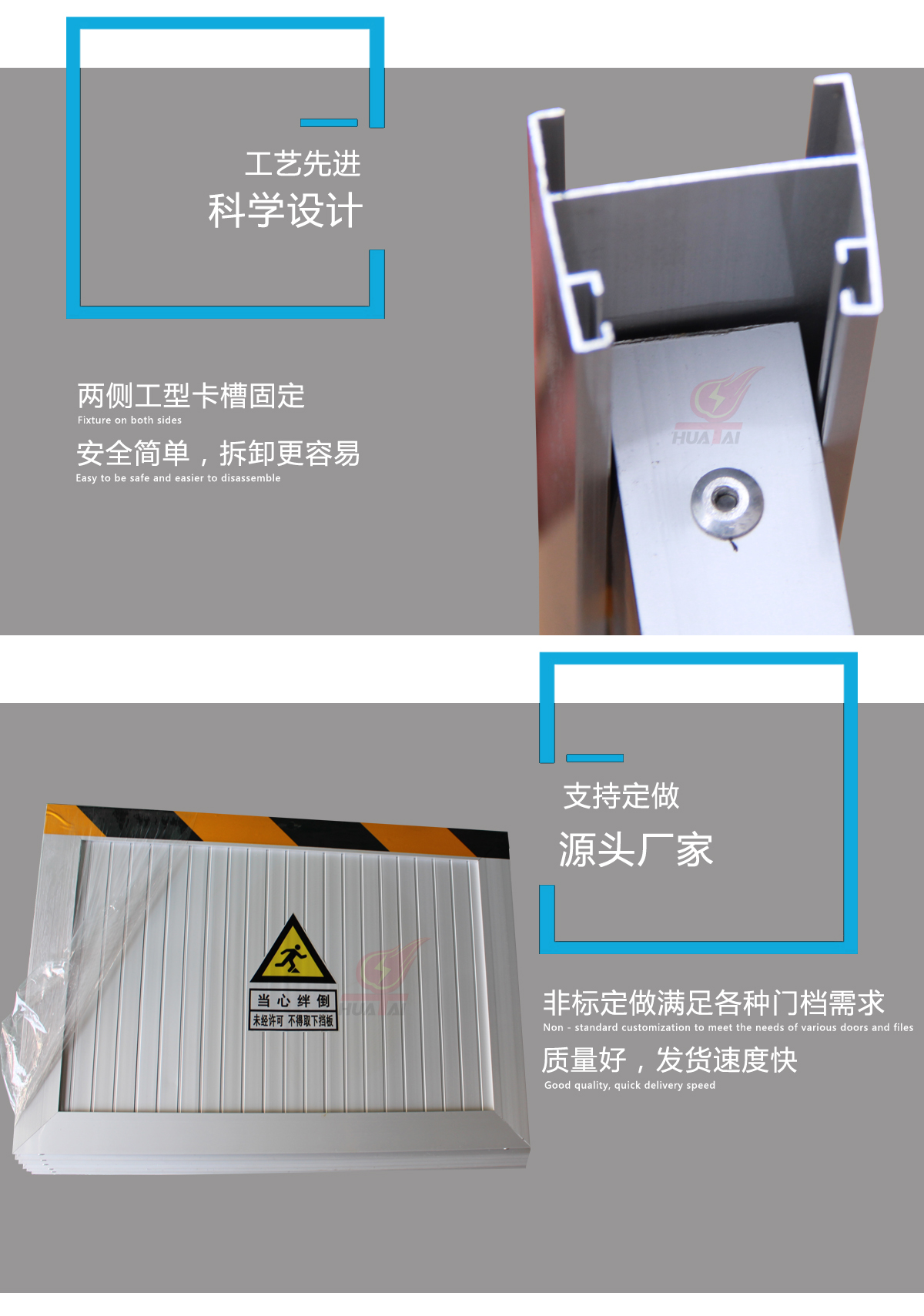 擋鼠板由擋鼠板主板面和卡槽夠成,外觀可見(jiàn)部分為鋁合金定制,兩側(cè)的卡槽可用鉚釘延門框平行固定到門框上,需要時(shí)可把擋鼠板順卡槽的內(nèi)徑插入卡槽之中,不用時(shí)將擋鼠板取出,不影響門的正常開(kāi)關(guān)使用。擋鼠板表面經(jīng)過(guò)防腐處理,堅(jiān)硬、美觀。