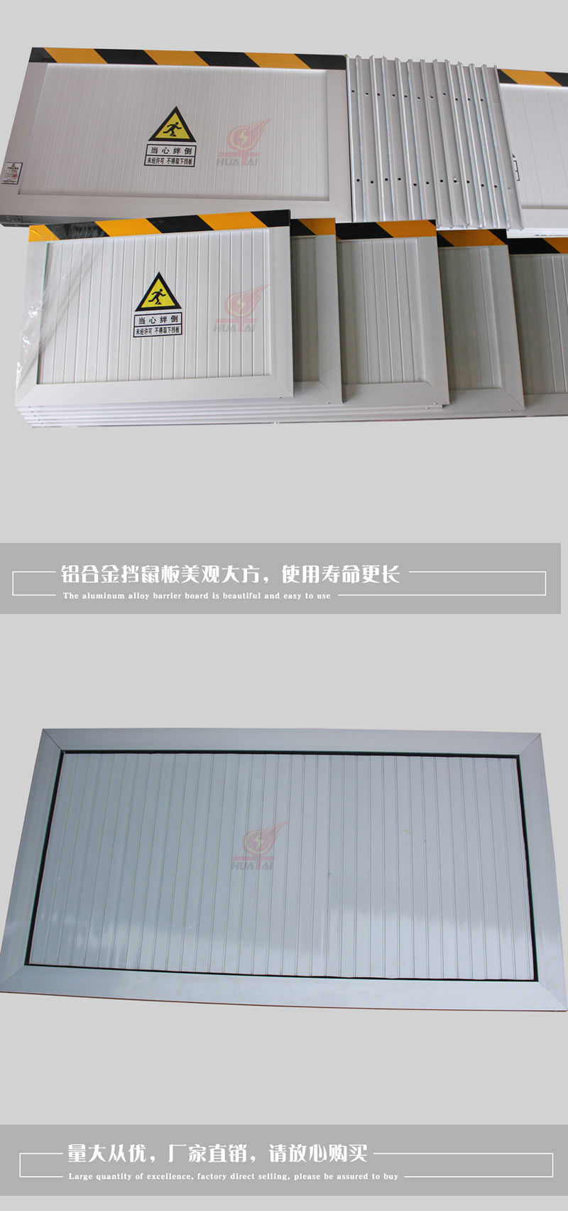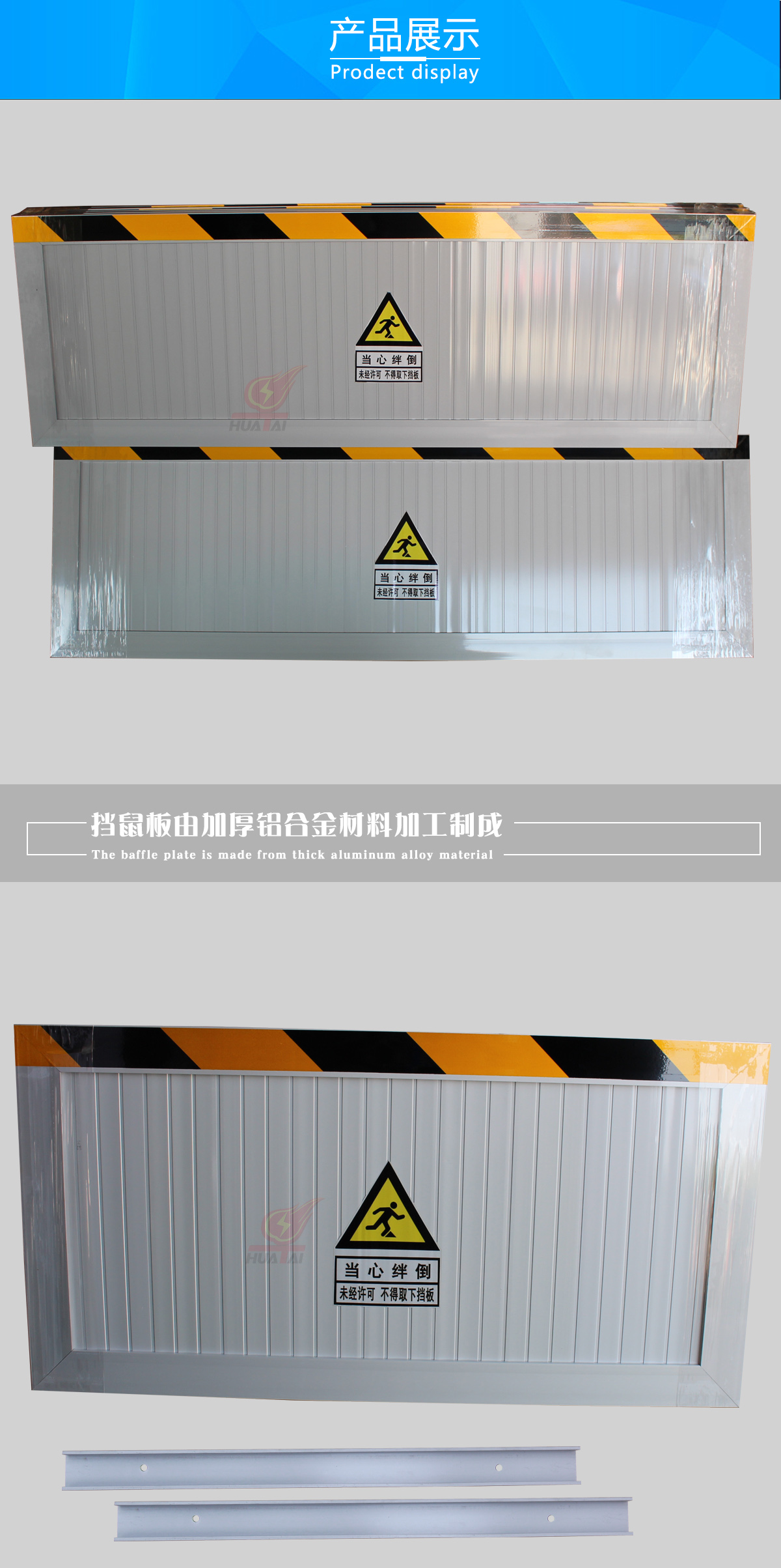 新型鋁合金材質擋鼠板替代老式擋鼠板材,實用、結實、耐用、使用時間長。由擋鼠板主板面和卡槽夠成,外觀可見部分為鋁合金定制,且貼有黃黑色的反光警示貼。