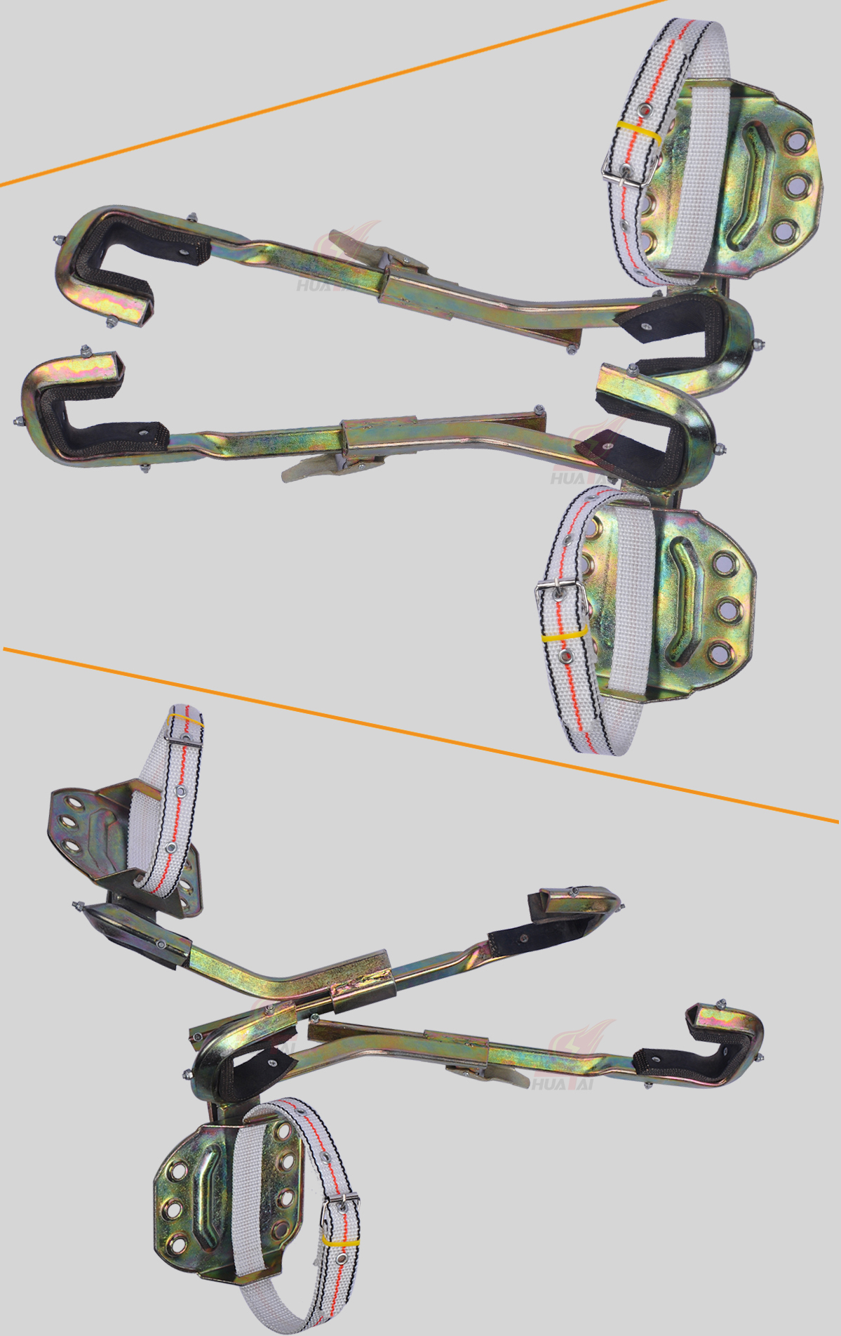 3、正式攀登前應(yīng)對腳扣作人體沖擊試登,判斷腳扣是否有變形和損傷。登桿前應(yīng)將腳扣登板的皮帶系牢,登桿過程中應(yīng)根據(jù)桿粗細(xì)隨時調(diào)整腳扣尺寸。