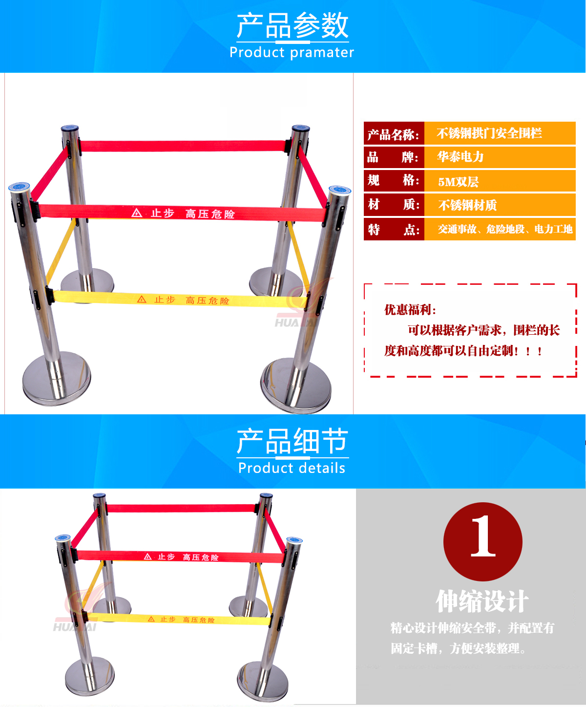 帶式伸縮圍欄 高度1米,筒體的直徑是76mm,筒的壁為0.8個厚,底盤是 350mm。 帶子最長做到5米,帶寬5cm 。可以雙層也可以單層帶子,兩層帶子的間距30厘米,一般是上紅下黃,紅色帶子上印 黃字(白字),黃色帶子上印紅字。這樣比較醒目。字分熒光字和普通字。 “閃電符號 止步 高壓危險/危險/止步 危險” 等等,可以根據客戶要求定做。每根立柱上都含有帶子,四個方向都可以掛帶子。熒光式安全警示帶圍欄,產品設計精美,使用靈活,隨意伸縮,隨意間距,和分割 形狀,無限連接等特點。