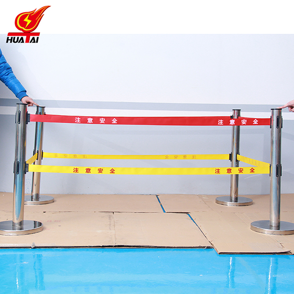 帶式伸縮圍欄 高度1米,筒體的直徑是76mm,筒的壁為0.8個厚,底盤是 350mm。     帶子最長做到5米,帶寬5cm ??梢噪p層也可以單層帶子,兩層帶子的間距30厘米,一般是上紅下黃,紅色帶子上印 黃字(白字),黃色帶子上印紅字。這樣比較醒目。字分熒光字和普通字。 “閃電符號 止步 高壓危險/危險/止步 危險”  等等,可以根據客戶要求定做。每根立柱上都含有帶子,四個方向都可以掛帶子。熒光式安全警示帶圍欄,產品設計精美,使用靈活,隨意伸縮,隨意間距,和分割 形狀,無限連接等特點。